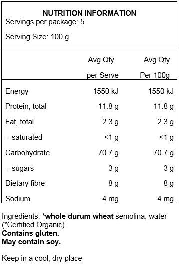 Durum whole wheat semolina (100% Organic). May contain traces of soy.
