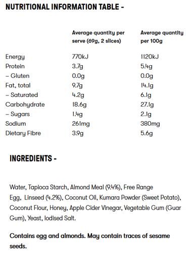 Water, Tapioca Starch, Free range egg, Almond meal (11%), Linseed (5%), Coconut oil, Kumara powder, Coconut flour, Honey, Yeast, Cider vinegar, Vegetable gum (Guar gum), Salt. Contains Egg and Tree nuts. May be present Sesame seeds.